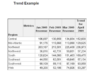 The report below shows an example of trend function. The report contains three conditional metrics : Jan 2009 Revenue, Feb 2009 Revenue and Mar 2009 Revenue. It also contains trend for April 2009 Revenue metric, which uses the following formula;