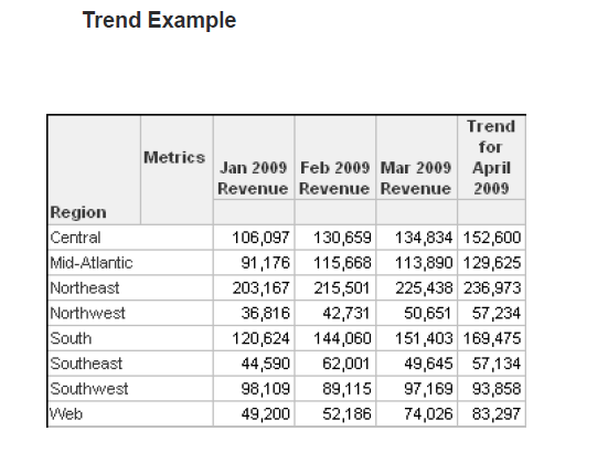The report below shows an example of trend function. The report contains three conditional metrics : Jan 2009 Revenue, Feb 2009 Revenue and Mar 2009 Revenue. It also contains trend for April 2009 Revenue metric, which uses the following formula;