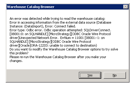 Recently was working on setting up Oracle 11.x environment on MicroStrategy & faced the below issue on opening the WH Catalog and also while creating the DSN through MicroStrategy Connectivity Wizard.